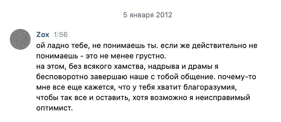На сайте подкаста есть скриншот этого сообщения: «На этом, без всякого хамства, надрыва и драмы, я бесповоротно завершаю наше с тобой общение. Почему-то мне кажется, что у тебя хватит благоразумия, чтобы так все оставить, хотя, возможно, я неисправимый оптимист».